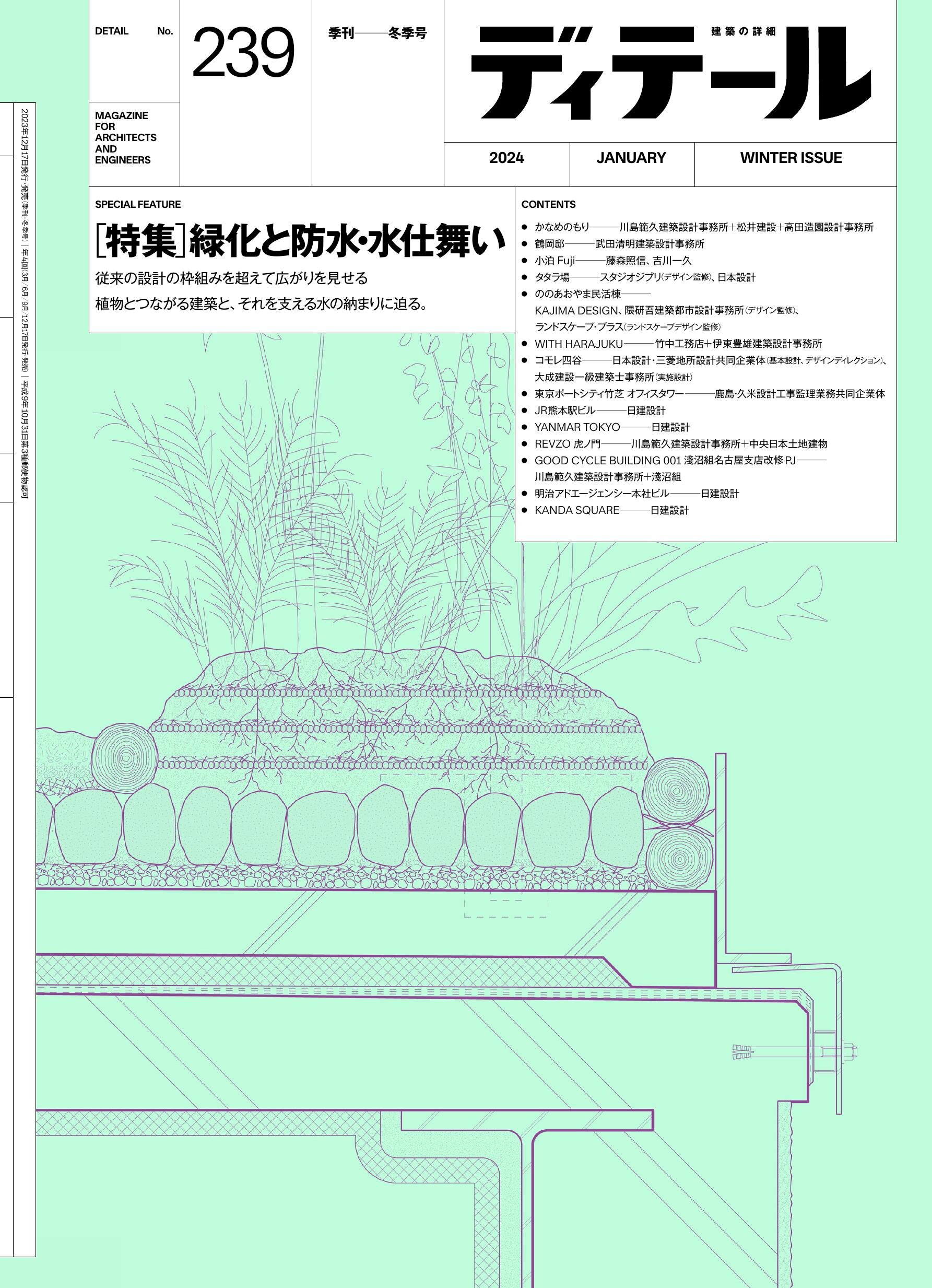 ■ 特集「緑化と防水・水仕舞い」 「建築と緑のシームレスな関係づくり」中村雅友/鼎談「 「ハイブリッド・リジェネラティブ」を目指して」武田清明/武田清明建築設計事務所×羽鳥達也/日建設計×川島範久/「かなめのもり」川島範久建築設計事務所+松井建設+高田造園設計事務所/「鶴岡邸」武田清明建築設計事務所/「小泊 Fuji」藤森照信+吉川一久/「タタラ場」スタジオジブリ(デザイン監修)+日本設計/「ののあおやま民活棟」KAJIMA DESIGN+隈研吾建築都市設計事務所(デザイン監修)+ランドスケープ・プラス(ランドスケープデザイン監修)/「WITH HARAJUKU」竹中工務店+伊東豊雄建築設計事務所/「コモレ四谷」日本設計・三菱地所設計共同企業体(基本設計、デザインディレクション)+大成建設一級建築士事務所(実施設計)/「東京ポートシティ竹芝 オフィスタワー」鹿島・久米設計工事監理業務共同企業体/「JR熊本駅ビル」日建設計/青木亜美+小松良朗+岩田友紀+羽月喜通/「YANMAR TOKYO」日建設計/江副敏史+黒木悠真+小松良朗/「REVZO 虎ノ門」川島範久建築設計事務所+中央日本土地建物/「GOOD CYCLE BUILDING 001 淺沼組名古屋支店改修 PJ」川島範久建築設計事務所+淺沼組/「明治アドエージェンシー本社ビル」日建設計/羽鳥達也+花岡竜樹+大石茉由佳/「KANDA SQUARE」日建設計/森隆+上地弘起