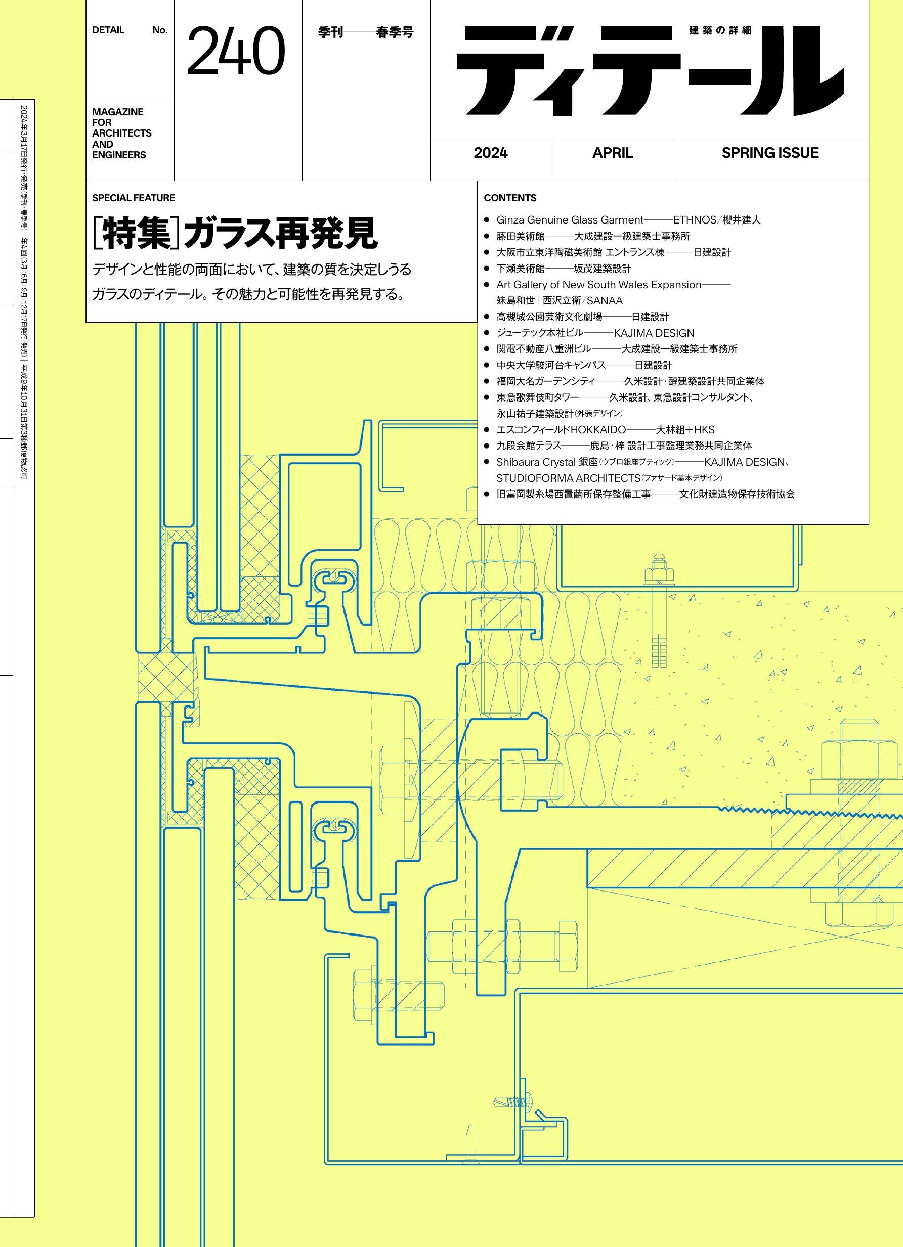 ■ 特集「ガラス再発見」 「ガラスの支持構法の変遷─これからのガラスと建築のゆくえ」松延晋/「ガラス支持の検討ポイント─透明感の表現とその実現に向けて」櫻井克哉/「ガラス支持の構造と構法」マトリクス/「ガラス開口部と脱炭素化」天野裕/「Ginza Genuine Glass Garment」ETHNOS/櫻井建人/「藤田美術館」大成建設一級建築士事務所/「大阪市立東洋陶磁美術館 エントランス棟」日建設計/下坂浩和+山田祥平/「下瀬美術館」坂茂建築設計/「Art Gallery of New South Wales Expansion」妹島和世+西沢立衛/SANAA/「高槻城公園芸術文化劇場」日建設計/江副敏史+多喜茂+高畑貴良志+差尾孝裕「ジューテック本社ビル」KAJIMA DESIGN/「関電不動産八重洲ビル」大成建設一級建築士事務所/「中央大学駿河台キャンパス」日建設計/髙野勝也+八里直輝+小野秀明+山賀千恵子+田代晶子/「福岡大名ガーデンシティ」久米設計・醇建築設計共同企業体/「東急歌舞伎町タワー」久米設計+東急設計コンサルタント+永山祐子建築設計(外装デザイン)/「エスコンフィールドHOKKAIDO」大林組+HKS/「九段会館テラス」鹿島・梓設計工事監理業務共同企業体/「Shibaura Crystal 銀座(ウブロ銀座ブティック)」KAJIMA DESIGN+STUDIOFORMA ARCHITECTS(ファサード基本デザイン)/「旧富岡製糸場西置繭所保存整備工事」文化財建造物保存技術協会