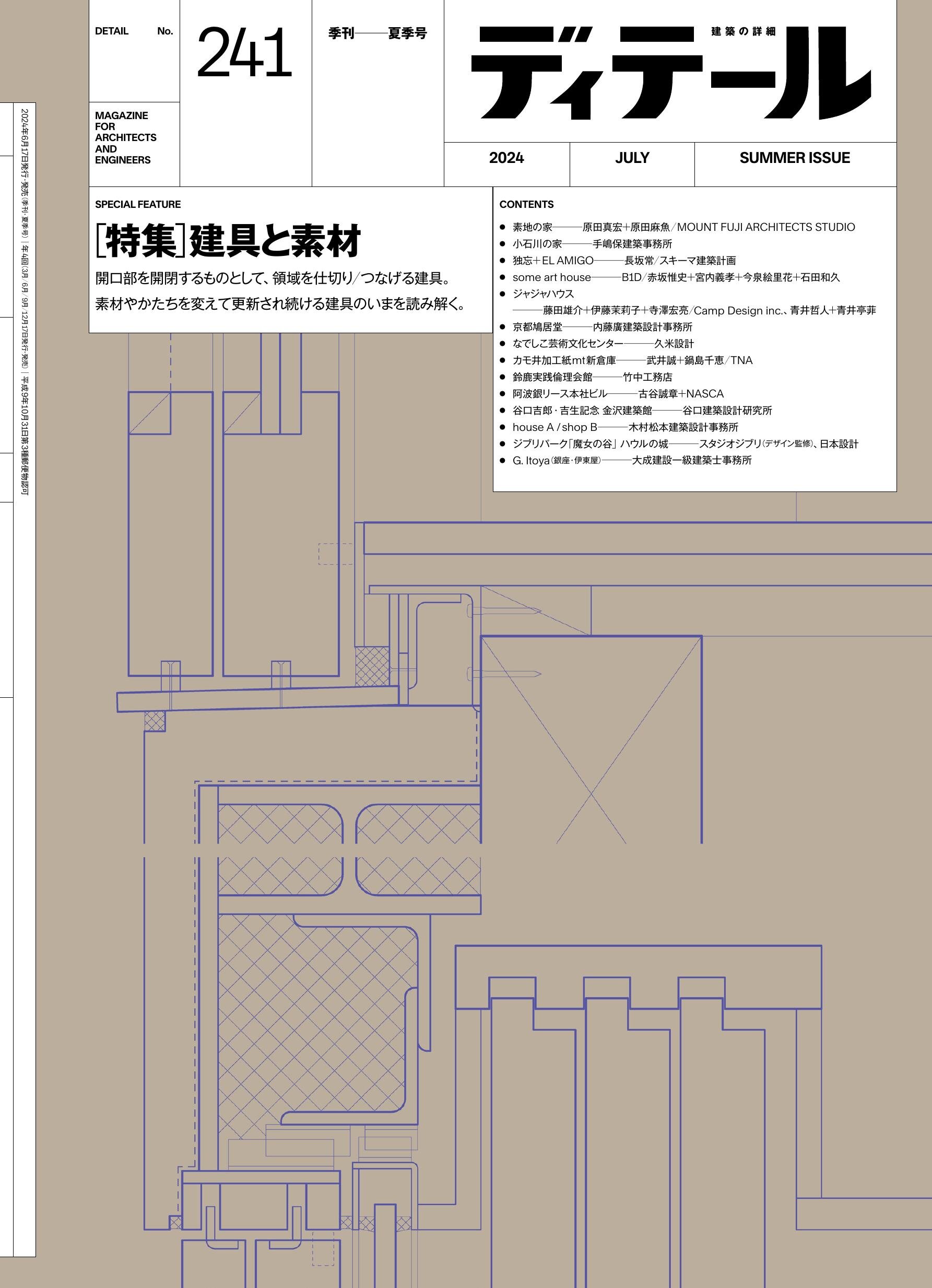■ 特集「建具と素材」 「スチール製扉のデザインとディテール」中藤泰昭/建具の視点|1「物と物の関係としての建具」原田真宏+原田麻魚/建具の視点|2「場所の記憶、関係性を宿す建具」手嶋保/建具の視点|3「人のアクティビティをかたちづくる建具」長坂常/「素地の家」原田真宏+原田麻魚/MOUNT FUJI ARCHITECTS STUDIO/「小石川の家」手嶋保建築事務所/「独忘+EL AMIGO」長坂常/スキーマ建築計画/「some art house」B1D /赤坂惟史+宮内義孝+今泉絵里花+石田和久/「ジャジャハウス」藤田雄介+伊藤茉莉子+寺澤宏亮/Camp Design inc.・青井哲人+青井亭菲/「京都鳩居堂」内藤廣建築設計事務所/「なでしこ芸術文化センター」久米設計/「カモ井加工紙mt新倉庫」武井誠+鍋島千恵/TNA/「鈴鹿実践倫理会館」竹中工務店