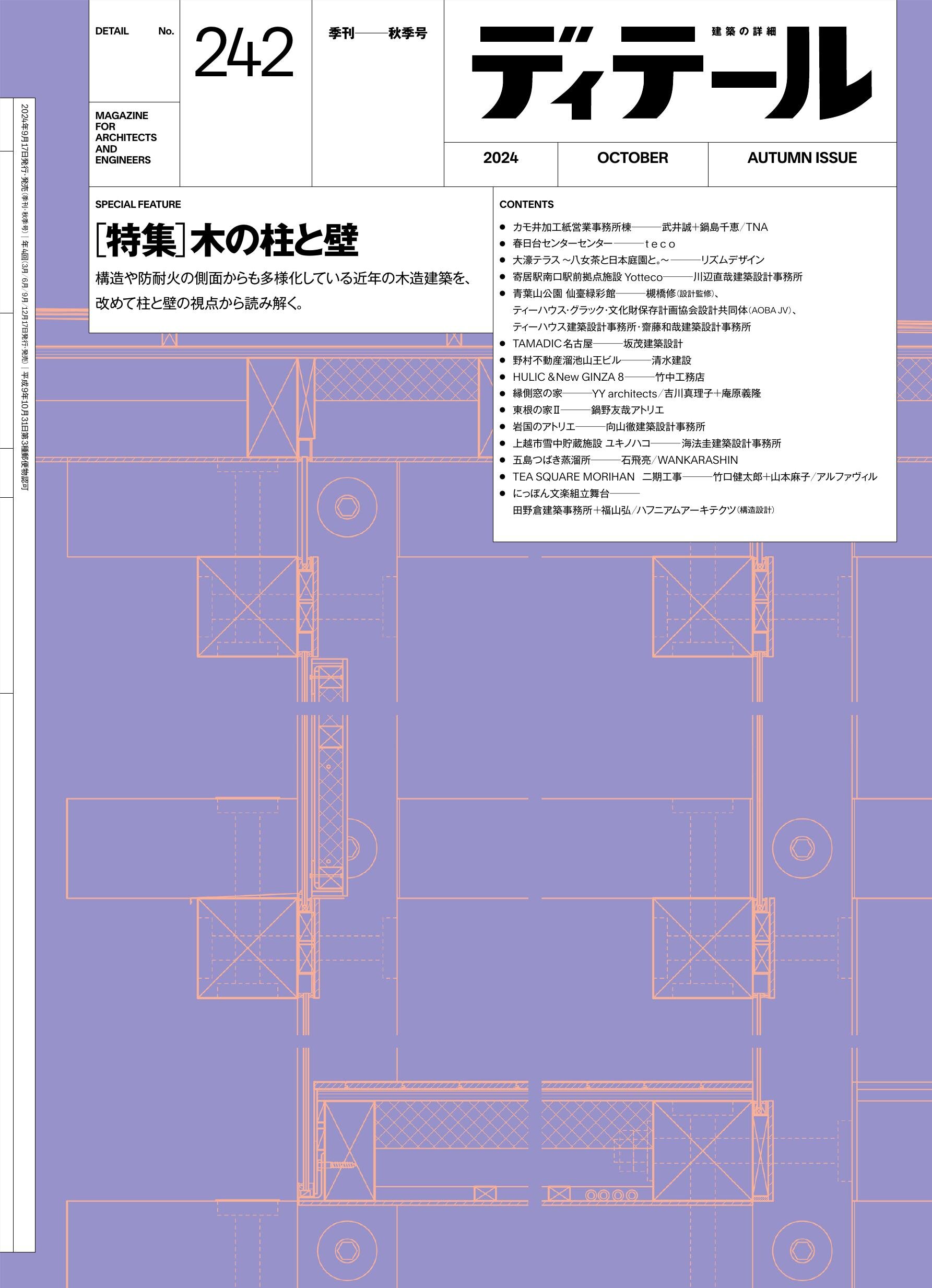 ■ 特集「木の柱と壁」 「木造建築 延床面積と高さ」マトリクス 収録作品データ/「木造の立面を考える」鍋野友哉/「スケールと木造における柱と壁」福山弘/「柱と間」河野泰治/「カモ井加工紙営業事務所棟」武井誠+鍋島千恵/TNA/「春日台センターセンター」teco/「大濠テラス ~八女茶と日本庭園と。~」リズムデザイン/「寄居駅南口駅前拠点施設 Yotteco」川辺直哉建築設計事務所/「青葉山公園 仙臺緑彩館」槻橋修(設計監修)・ティーハウス・グラック+文化財保存計画協会設計共同体(AOBA JV)(基本設計)・ティーハウス建築設計事務所+齋藤和哉建築設計事務所(実施設計)/「TAMADIC名古屋」坂茂建築設計/「野村不動産溜池山王ビル」清水建設/「HULIC &New GINZA 8」竹中工務店/「縁側窓の家」YY architects/吉川真理子+庵原義隆/「東根の家Ⅱ」鍋野友哉アトリエ/「岩国のアトリエ」向山徹建築設計事務所/向山徹+衞藤翔平/「上越市雪中貯蔵施設 ユキノハコ」海法圭建築設計事務所/「五島つばき蒸溜所」石飛亮/WANKARASHIN/「TEA SQUARE MORIHAN 二期工事」竹口健太郎+山本麻子/アルファヴィル/「にっぽん文楽組立舞台」田野倉建築事務所+福山弘/ハフニアムアーキテクツ(構造設計)