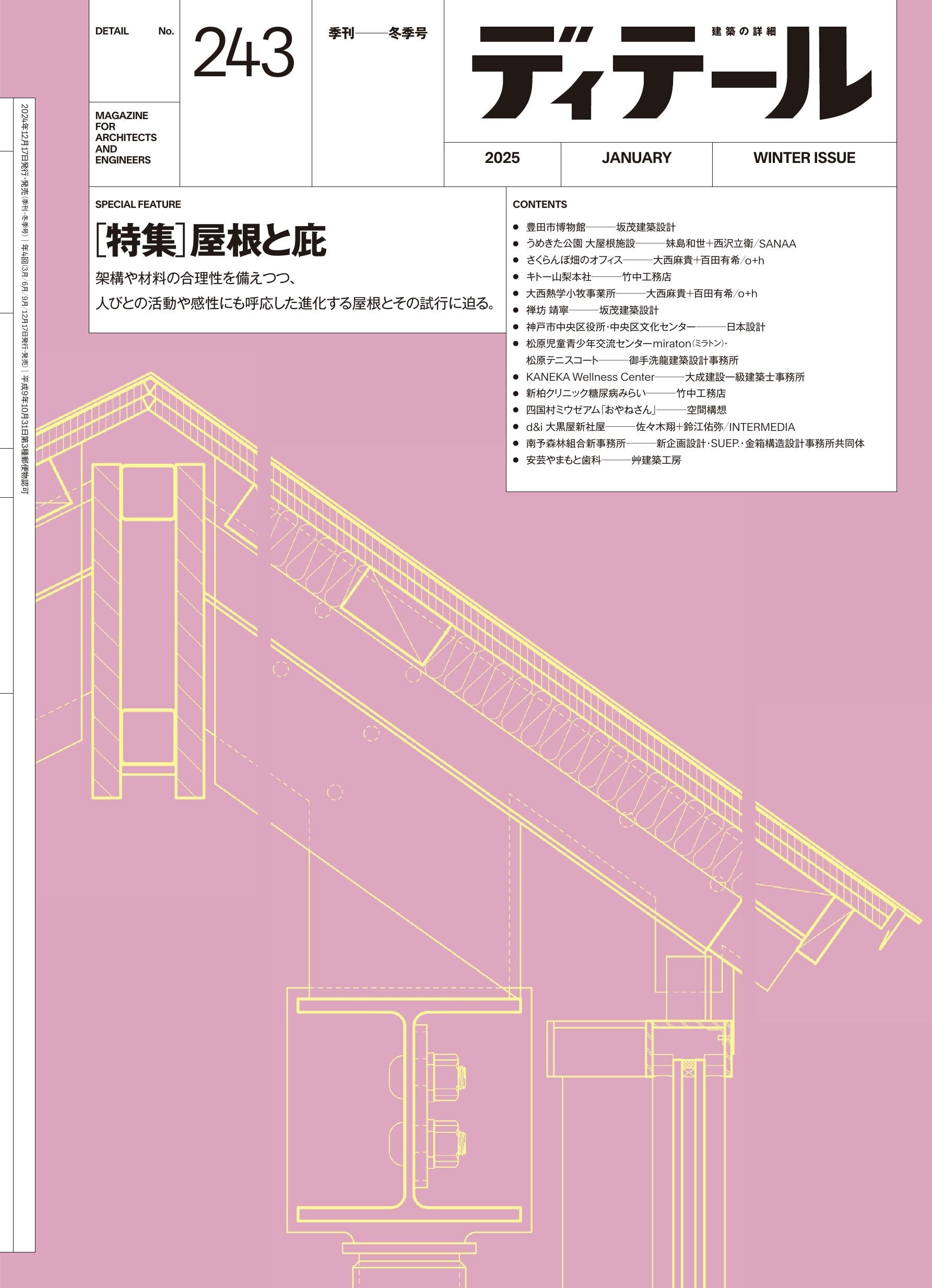 ■ 特集「屋根と庇」 「屋根と材料」徳渕正毅・江村哲哉・後藤一真/「屋根葺き材に見る 屋根と軒先のディテール」大石卓人/「豊田市博物館」坂茂建築設計/「うめきた公園 大屋根施設」妹島和世+西沢立衛/SANAA/「さくらんぼ畑のオフィス」大西麻貴+百田有希/o+h/「キトー山梨本社」竹中工務店/中楯哲史+梅原豊+齊藤康男/「大西熱学小牧事業所」 大西麻貴+百田有希/o+h/「禅坊 靖寧」坂茂建築設計/「神戸市中央区役所・中央区文化センター」日本設計/垣口知久+松岡且祥+山本葵/「松原児童青少年交流センターmiraton(ミラトン)・松原テニスコート」御手洗龍建築設計事務所/「KANEKA Wellness Center」大成建設一級建築士事務所/「新柏クリニック糖尿病みらい」竹中工務店/「四国村ミウゼアム「おやねさん」」空間構想/「d&i 大黒屋新社屋」佐々木翔+鈴江佑弥/INTERMEDIA/「南予森林組合新事務所」新企画設計・SUEP.・金箱構造設計事務所共同体/「安芸やまもと歯科」艸建築工房