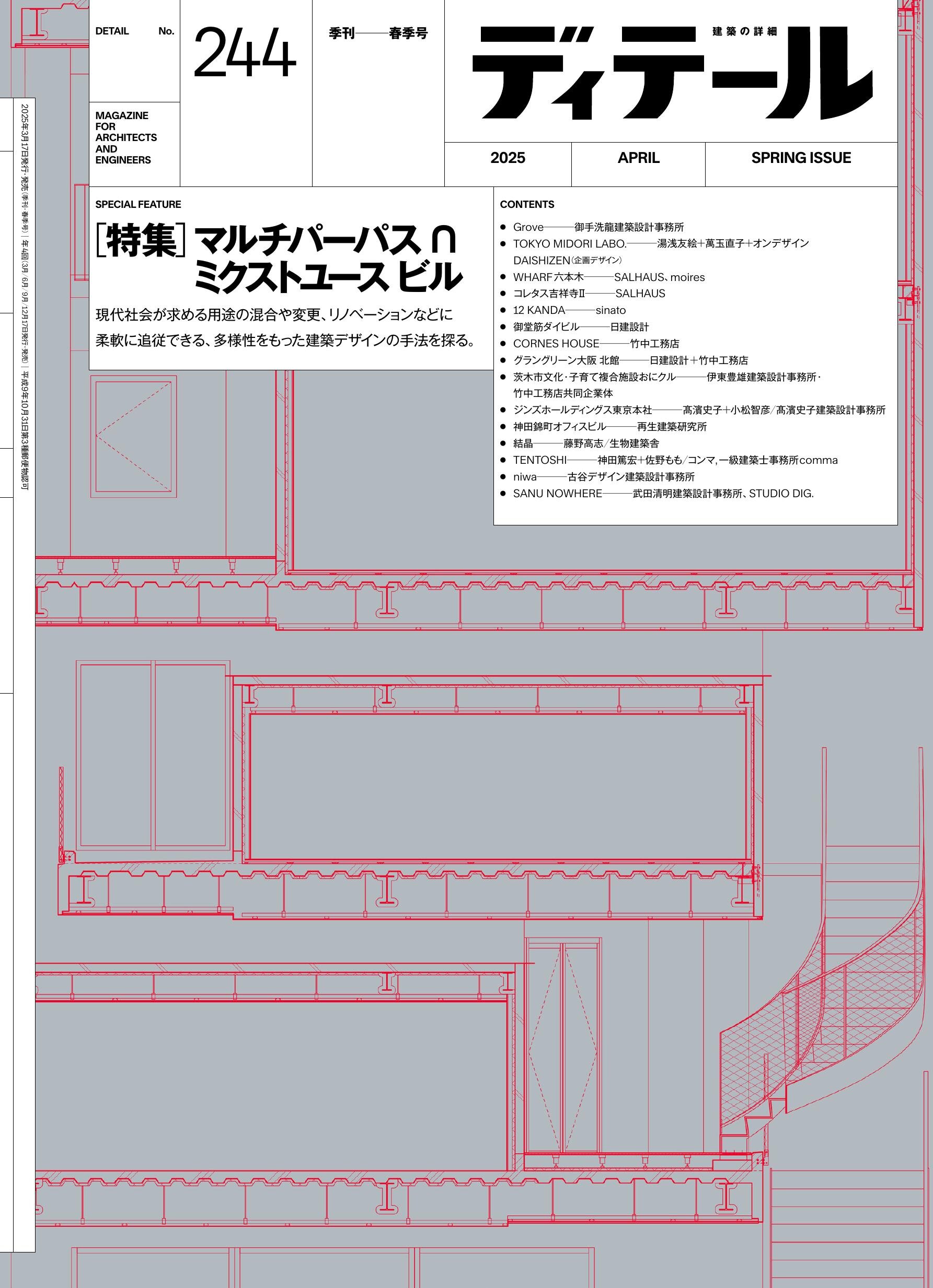 ■ 特集「マルチパーパス∩ミクストユース ビル」 「マルチパーパス∩ミクストユース ビル ─予測困難な時代が欲する変化に、柔軟に追従できる建築デザイン」山梨知彦/座談「建築の「多様性」のオルタナティブをめぐって」御手洗龍/御手洗龍建築設計事務所+安原幹/SALHAUS+花岡郁哉/竹中工務店×山梨知彦/日建設計/「Grove」御手洗龍建築設計事務所/「TOKYO MIDORI LABO.」湯浅友絵+萬玉直子+オンデザイン・DAISHIZEN(企画デザイン)/「WHARF六本木」SALHAUS・moires/「コレタス吉祥寺Ⅱ」SALHAUS/「12 KANDA」sinato/「御堂筋ダイビル」日建設計/喜多主税+金子公亮+谷口尚史/「CORNES HOUSE」竹中工務店/「グラングリーン大阪 北館」日建設計+竹中工務店/「茨木市文化・子育て複合施設おにクル」伊東豊雄建築設計事務所・竹中工務店共同企業体/「ジンズホールディングス東京本社」髙濱史子+小松智彦/髙濱史子建築設計事務所/「神田錦町オフィスビル」再生建築研究所/「結晶」藤野高志/生物建築舎/「TENTOSHI」神田篤宏+佐野もも/コンマ・一級建築士事務所comma/「niwa」古谷デザイン建築設計事務所/「SANU NOWHERE」武田清明建築設計事務所・STUDIO DIG.