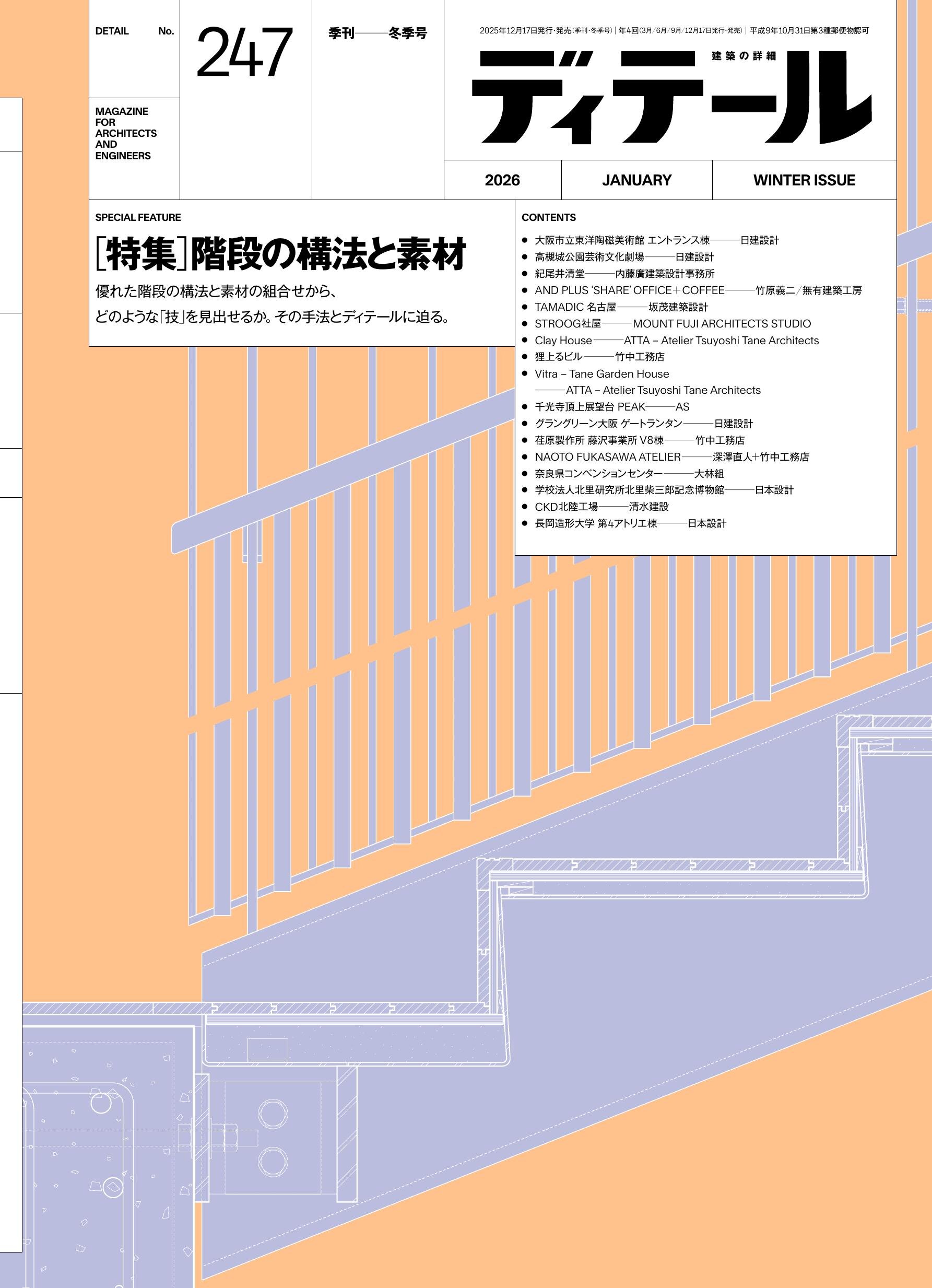 ■特集 「階段の構法と素材」 「階段の構法と素材の「わざ」」下坂浩和/下坂浩和建築設計 /「大阪市立東洋陶磁美術館 エントランス棟」日建設計/「高槻城公園芸術文化劇場」日建設計/江副敏史+多喜茂+高畑貴良志+差尾孝裕/「紀尾井清堂」内藤廣建築設計事務所/「AND PLUS ‘SHARE’ OFFICE+COFFEE」竹原義二/無有建築工房/「TAMADIC 名古屋」坂茂建築設計/「STROOG社屋」MOUNT FUJI ARCHITECTS STUDIO/「Clay House」ATTA – Atelier Tsuyoshi Tane Architects/「狸上るビル」竹中工務店/「Vitra – Tane Garden House」ATTA – Atelier Tsuyoshi Tane Architects/「千光寺頂上展望台 PEAK」AS/「グラングリーン大阪 ゲートランタン」日建設計/團野浩太郎+岡隆裕/「荏原製作所 藤沢事業所 V8棟」竹中工務店/「NAOTO FUKASAWA ATELIER」深澤直人+竹中工務店/「奈良県コンベンションセンター」大林組/「学校法人北里研究所北里柴三郎記念博物館」日本設計/安本高士+相薗恭平+東克彦/「CKD北陸工場」清水建設/「長岡造形大学 第4アトリエ棟」日本設計/河野建介+加藤福子+小泉翔+中村伸+玉木智大+藤原光太